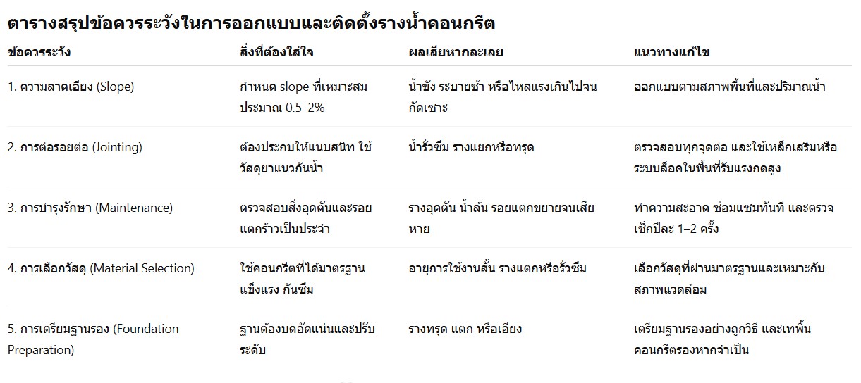 การออกแบบและติดตั้งรางน้ำคอนกรีตไม่ได้จบเพียงการเลือกแบบ V หรือ U แต่ยังต้องคำนึงถึง **ความลาดเอียงที่ถูกต้อง การต่อรอยต่อที่แน่นหนา และการดูแลรักษาอย่างต่อเนื่อง**